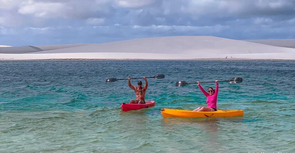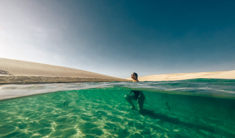 Na região dos Lençóis Maranhenses, você pode praticar seu esporte favorito nadando em uma lagoa de água cristalina ou até se aventurar com seu grupo de amigos e nadar na foz do Rio Preguiças em um cenário paradisíaco.